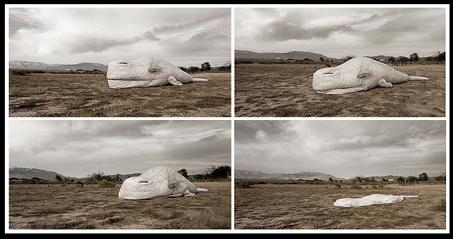 | Alto Cumulus: Tyvek, electric fans, dimensions variable, each cloud 305 x 610 x 300 cm. Hart House Installation, 2006 | Horses: vinyl, electric fans, each horse 8 x 10 x 2 meters, Beaverbrook Art Gallery, Fredericton, N.B., 2003. |