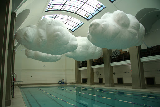 | Quadriga II: Nylon spinnaker, each horse 9 meters tall, Union Station, Toronto, 2007 | Alto Cumulus: Tyvek, electric fans, dimensions variable, each cloud 305 x 610 x 300 cm. Hart House Installation, 2006 |