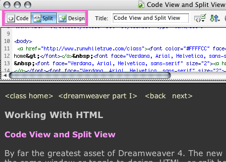 This enables one to see your code and design page in the same window or toggle to design, html, or split between the two with ease.